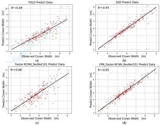 (a) Linear regression graphs of (1) the YOLO model; (b) linear regression graphs of (2) the SSD model; (c) linear regression graphs of (3) the Faster-RCNN_ResNet101 model; (d) linear regression graphs of (4) the FPN_Faster-RCNN_ResNet101 model.