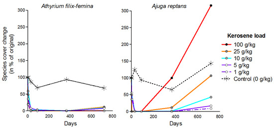 Shoots of Ajuga reptans were even more vulnerable to kerosene exposure compared to Athyrium filix-femina, because, 1 month after the beginning of the experiment, all individuals in the quadrats with kerosene exposure died. At the same time, during the second growing season, new individuals appeared in some quadrats (100 g/kg and 25 g/kg), and the species coverage recovered up to 100% of the original (Figure S1 ). It should be noted that all new individuals emerged through vegetative propagation using above-ground stolons from off-site mother plants. In doing so, they retained the connection of their vascular system with the mother plant outside the quadrat, which probably allows them to avoid the phytotoxic effects of kerosene without rooting in the contaminated soil. Meanwhile, 2 years after kerosene exposure, bugle coverage continued to grow (reliably for all doses, p = 0.027; Figure 5) in proportion to the increase in kerosene load applied. The success in the colonization of the sites by the above-ground stolons of A. reptans, probably, first of all, should be associated with the absence of competition with other vascular plants at high doses of the pollutant.