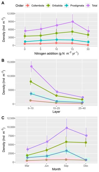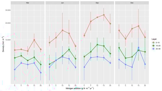 Unsurprisingly, we found strong seasonal variations in soil microarthropod density. In winter, the change in soil microarthropods with the increasing amounts of nitrogen application was not as obvious as in other seasons (Figure 2), likely due to the increase in environmental stress, such as the lower temperature, precipitation [61] and the loss of food availability [62].