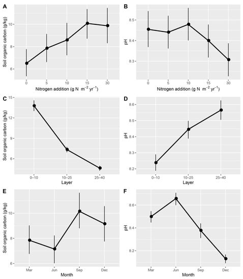 The responses of soil organic carbon ((A) for correlation between N addition and soil organic carbon, (C) for correlation between soil layer and soil organic carbon, (E) for correlation between sampling date and soil organic carbon) and pH ((B) for correlation between N addition and soil pH, (D) for correlation between soil layer and soil pH, (F) for correlation between sampling date and soil pH) to nitrogen application rate in three soil depths over four sampling dates. Values are means with bootstrapped 95% confidence intervals (CI). Differences are significant at α = 0.05 when the CIs do not overlap with the means of other groups.