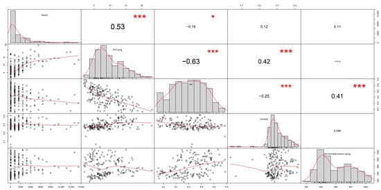 Pearson correlations between soil microarthropod density (Abund), soil organic carbon (SOC), soil pH, soil moisture (humidity) and soil microbial biomass carbon (SMBC). Below the diagonal are the bivariate scatter plots with a smooth line. Above the diagonal, the correlation coefficients and the significance level (* p < 0.05, *** p < 0.001) are shown. Units associated with variables are shown in Figure 1, Figure 2 and Figure 3.