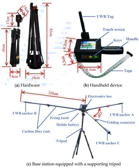 The hardware for measuring tree DBH and tree position mainly consisted of a handheld device (weight 293 g and price USD 80), a base station (weight 2092 g and price USD 280), and a supporting tripod (weight 1263 g and price USD 30), with a total weight of 3648 g and a total price of USD 390, as shown in Figure 2. The handheld device was mainly composed of a tape, keys, a handle, a touch screen, a UWB tag, and other built-in electronic and mechanical components (a TMR encoder, a printed circuit board, and so on, as shown in Section 2.2.3), as shown in Figure 2b. The printed circuit board was designed using the LICHUANG-EDA software, and embedded with an altimeter, power module, a micro-controller unit (MCU), a secure digital memory card (SD card), Bluetooth, and circuit interfaces. The basic descriptions of the handheld device’s electronic components are listed in Appendix A (Table A1). The base station consisted of an electronics box, a mobile battery, and three 1.35 m long poles (interval 120°) with a UWB module, a fixing knob, a folding connector, and two carbon fiber rods, as shown in Figure 2c. The electronics box was mainly composed of a 3D electronic compass to obtain attitude angles (roll, pitch, heading, as shown in Section 2.2.4). The basic descriptions of the base station’s electronic components are listed in Appendix B (Table A2). The three poles and tripod could be folded and shrunk, which facilitated survey crews in the field with carrying the base station, as shown in Figure 2a,c. During measurements, the handheld device could measure tree DBH and altitude data alone, and the distances between the tag and three anchors were obtained through cooperation with the base station.