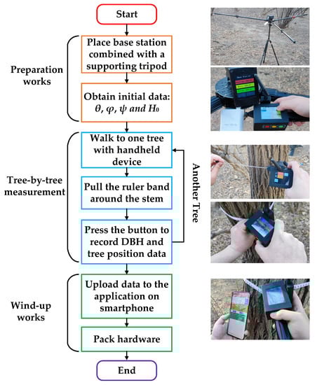 Figure 3 presents the workflow for measuring tree DBH and tree position in a plot. The measurement workflow was as follows: