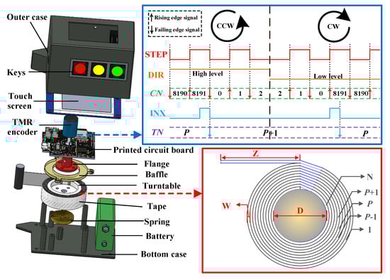 Internal structure and the tree DBH measurement principle of the handheld device. Blue rectangle, the timing of electrical signals diagram output by the TMR encoder to the MCU. Red rectangle, top view of the turntable and the tape.