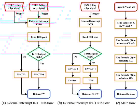 Figure 4 presents the internal structure and the tree DBH measurement principle of the handheld device. When the tape is pulled out, the turntable drives the flange to rotate at the same time. Furthermore, the flange drives the bearings of the TMR encoder to rotate simultaneously. Therefore, rotational information of the turntable can be sensed by the TMR encoder, such as encoding of a single cycle and the cumulative value of the rotational number of the turntable. Assume that encoding of a single cycle is CN and the cumulative value of the rotational number of the turntable is TN. CN from 0 to 8191 corresponds to the rotation position of the turntable from 0° to 360° in one rotation. TN equals the cumulative value of the increased or decreased number of rotations of the turntable under the action of the ruler belt pulling out or the spring recovery. According to the principle of a TMR encoder (Appendix C), we designed a tree DBH calculation program in the MCU (Figure 5). When the turntable rotates clockwise (CW), the DIR port of the TMR encoder outputs a low-level signal to the voltage detection port of the MCU, and when it rotates counterclockwise (CCW), the DIR signal is high. If the external interrupt INT0 port of the MCU detects a rising or a failing edge signal from the STEP port of TMR encoder, CN adds one or subtracts one between 0 and 8191, depending on whether the DIR signal is high or low, accordingly (blue rectangle in Figure 4 and Figure 5a). If the external interrupt INT1 port of the MCU detects a failing edge signal from the INX port of TMR encoder, TN also adds one or subtracts one depending on whether the DIR signal is high or low, accordingly (blue rectangle in Figure 4 and Figure 5b). After obtaining CN and TN, the tree DBH can be calculated by the MCU (Figure 5c).