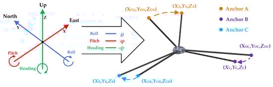 where is the angle of roll; is the angle of pitch; − is the angle of heading; (XA, YA, ZA), (XB, YB, ZB), and (XC, YC, ZC) are the spatial coordinates of Anchor A, Anchor B, and Anchor C, respectively; (XOA, YOA, ZOA), (XOB, YOB, ZOB), and (XOC, YOC, ZOC) are the original spatial coordinates of Anchor A, Anchor B, and Anchor C, respectively, when = 0, = 0, and − = 0.