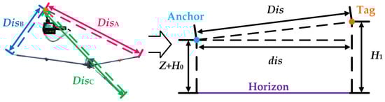 After obtaining ZA, ZB, and ZC, the 3D scalars H1, H0, DisA, DisB, and DisC are transformed into two-dimensional (2D) scalars in the OXY plane, as shown in Figure 7. DisA, DisB, and DisC are the linear distances between the tag and Anchor A, Anchor B, and Anchor C, respectively, in the 3D coordinate system. The principles of calculating DisA, DisB, and DisC are given in Appendix D.