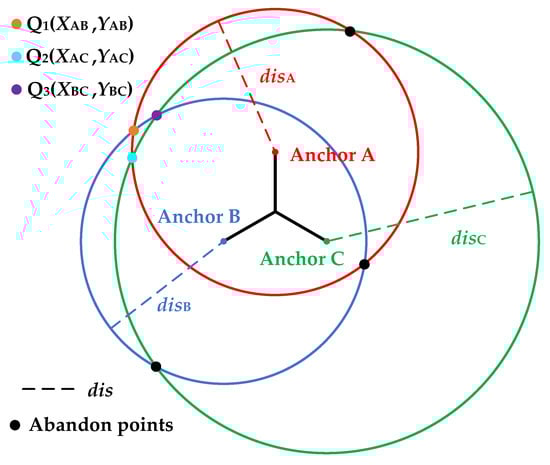 Although the penetration ability of UWB wireless signals is very strong, in an actual forest survey, the random ranging error may be caused by a thick tree stem, dense bushes, or a human body [,,,,], resulting in DisA, DisB, and DisC ( disA, disB, and disC) that may be slightly longer than the actual distances, and consequently, the three circles for positioning the tag may not intersect at one common point (Figure 8). The received signal strength indication (RSSI) theory [,,,] suggests ways to mitigate the effects of signal attenuation on ranging, to improve accuracy and to increase positioning precision [,,,].