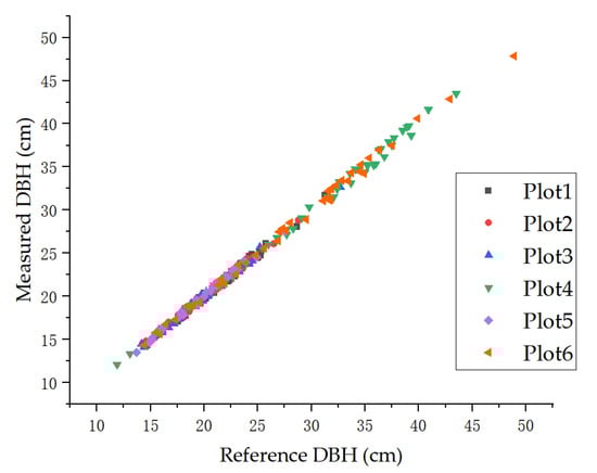Scatter plot between the measured tree DBH values using the presented method and the reference tree DBHs measured using a DBH tape.