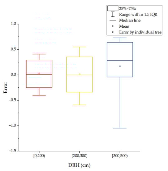 Distribution of the error in the tree DBH for different tree (DBH) sizes.