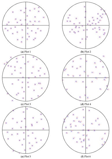 Measured and reference tree positions; (a) test plot number 1; (b) test plot number 2; (c) test plot number 3; (d) test plot number 4; (e) test plot number 5; (f) test plot number 6; the blue crosses represent the measurements; the red circles represent the references.