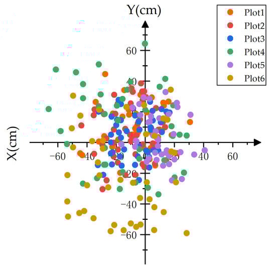 The measured and reference tree positions are given in Figure 11. The bias ranged from approximately −15.92 to 9.92 cm on the x-axis and from −25.90 to 10.88 cm on the y-axis (Table 3). The RMSEs in the x-axis (21.51 cm) and y-axis (22.49 cm) directions were similar (Table 3). Figure 12 presents the errors of the distance (Ed) between the measured and corresponding reference position values by individual tree, ranging from 2.02 to 77.54 cm in the OXY plane. The mean value of the Ed was 27.11 cm, with a standard deviation of 15.30 cm across plots, and ranging from 19.30 to 42.06 cm by plot (Table 4). The RMSE and average Ed values of Plot 4 and Plot 6 were relatively larger than the other four plots. Therefore, if a plot had a larger mean DBH, the RMSE and Ed were relatively larger.