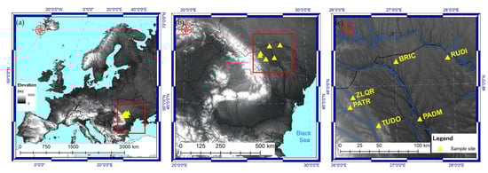 The study area is located in the northern part of the Moldavian Plateau, which is situated in the northeastern part of Romania and the northern part of the Republic of Moldova (Figure 1). The northern Moldavian Plateau is characterized by a series of alternating ridges, depression, and asymmetric valleys [31]. The highest elevations (~700 m.a.s.l.) are situated in the northwestern part of the plateau, decreasing towards the eastern and southern parts of the plateau to levels around 200 m.a.s.l. The climate is temperate-continental, with cold winters and warm summers [32]. The monthly mean temperature ranges from −2.2 °C (in January) to +21.8 °C (in July) [32,33], while the annual precipitation sum is on average 520 mm, with a minimum in January (~26 mm) and a maximum in June (~76 mm) [32,33].