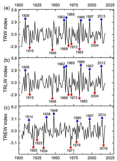 The temporal evolution (PC1) associated with EOF1 (Figure 2) indicates that the most extreme positive TREW years were 1914, 1938, 1948, 1980, 1997, and 2014, while the most extreme negative ones were 1920, 1925, 1934, 1971, 1979, and 2016. For TRLW and TRW, the most extreme positive years were 1909, 1962, 1965, 1985, 1997, and 2013, while the most extreme negative ones were 1915, 1946, 1968, 1972, 1983, and 2004 (Table 4).