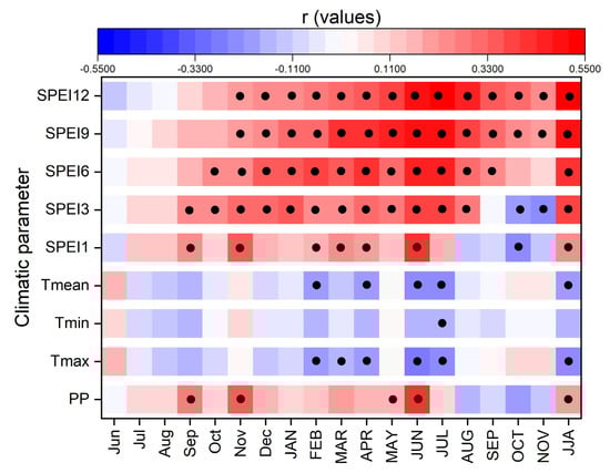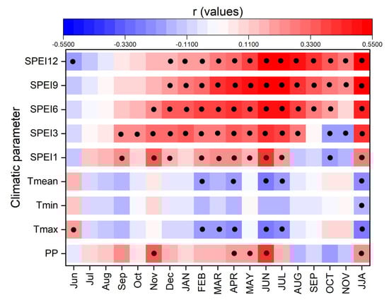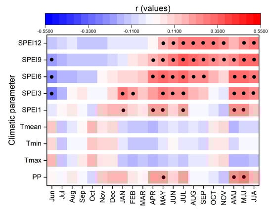 Climate growth relationship for total tree-ring width over the 1901–2019 period (uppercase months—current year; lowercase months—the previous year; JJA—June, July, August), PP—monthly precipitation, Tmin—monthly minimum temperature, Tmean—monthly mean temperature, Tmax—monthly maximum temperature, SPEI—Standardized Potential Evapotranspiration Index for one month (SPEI1), three months (SPEI3), six months (SPEI6), nine months (SPEI9), and twelve months (SPEI12)). Significant correlations are represented by black dots (p > 0.05).