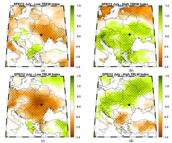 (a) Composite map between low TREW and SPEI12; (b) composite map between high TREW and SPEI12; (c) same as in (a), except for TRLW; (d) same as in (b), except for TRLW. The hatching highlights significant values at a confidence level of 95%. Analyzed period: 1901–2019. Black stars indicate the site location.