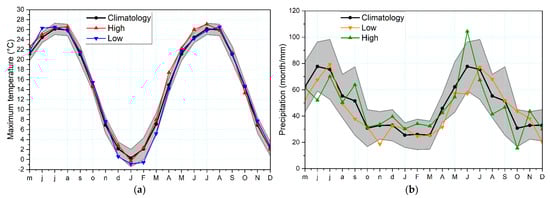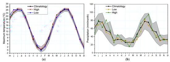 Temporal evolution of the seasonal cycle for (a) maximum monthly temperature and (b) monthly precipitation during years with extreme TRLW values. The black lines indicate the seasonal cycle over the period 1971–2000, the red and green lines indicate the seasonal cycle for high extreme values of TRLW, and the blue and orange lines indicate the seasonal cycle for low extreme values of TRLW. Where the coloured lines lie outside the grey shading, deviations higher/lower than 0.75 SD from average conditions occur. The analyses were made from May of the previous year (lowercase letters) until December of the current year (uppercase letters).