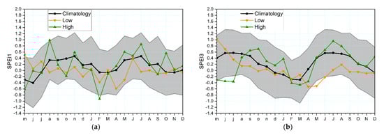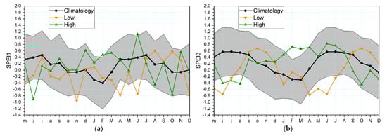 The seasonal cycle of the SPEI drought index was calculated for different periods of accumulation, from 1 to 12 months. The SPEI1 drought index for the selected extreme years presents increased variability without a clear pattern (Figure 10a).