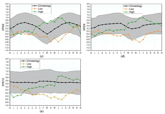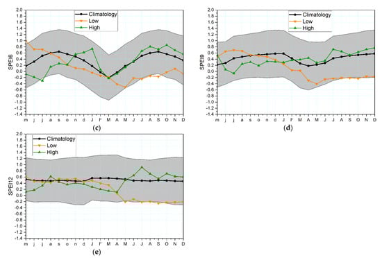 The seasonal variability of the drought index presents different results for extremely positive and negative years, as well as for different accumulation periods of SPEI. The high values of the previous year’s August SPEI1 and very low values of February SPEI1 have a significant influence on the positive TREW years. During extremely negative TREW years, the April and May SPEI1 both register low values (Figure 8a). Very low values of the previous year’s June and July SPEI3 have significant influence on the extremely high TREW values, and low values of April, May, and June SPEI3 have significant influence on the extremely low TREW values (Figure 8b). The temporal variability of SPEI6 is similar to that of SPEI3, namely, very low values of the previous year’s July SPEI3 significantly influence the extremely high TREW values, while low values of May to September SPEI6 have significant influence on the extremely low TREW values (Figure 8c). The temporal variability of SPEI9 and SPEI12 for the extreme positive TREW years fits within 0.75 SD of the climatological range, while for the extreme negative TREW years SPEI9 presents very low values from August to December, as does SPEI12 from May to October (Figure 8d,e).