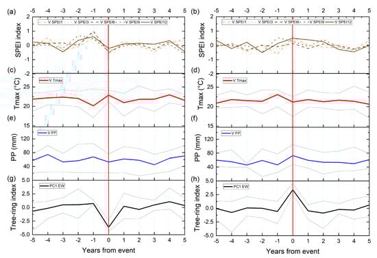 Superposed epoch analysis (SEA) for early wood tree-ring width (g,h) and main climatic parameters ((a,b)—SPEI drought index for different accumulation periods, (c,d)—monthly maximum temperature (Tmax), and (e,f)—monthly precipitation (PP) for the extreme negative years (left column) and extreme positive years (right column)). The grey lines in (c–h) indicate the maximum and minimum variability for the corresponding parameter during the selected extreme years.