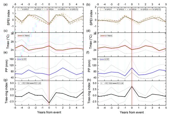 Superposed epoch analysis (SEA), for late wood tree-ring width (LW), total tree-ring width (RW) (g,h), and main climatic parameters ((a,b)—SPEI drought index for different accumulation periods, (c,d)—monthly maximum temperature (Tmax), and (e,f)—monthly precipitation (PP) for the extreme negative years (left column) and extreme positive years (right column)). The grey lines in (c–h) indicate the maximum and minimum variability for the corresponding parameter during the selected extreme years.