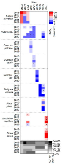 The AOT40 was higher at ABR1 than at the other sites for three out of the five years, with a maximum of 54,588 ppb·h recorded in 2018 (Supplementary Table S4 and Figure 1). The lowest values were at TRE1 (2019–2021) and CPZ (2018 and 2022), with a minimum of 8377 ppb·h at CPZ in 2022. POD1 did not depend on site conditions or on the species. For F. sylvatica, the highest POD1 values were at VEN1 (30.88 mmol m−2 in 2018), and the lowest ones were at ABR1 (6.43 mmol m−2). High POD1 values for this species at VEN1 were associated to the highest PII_ITP among all sites and years.