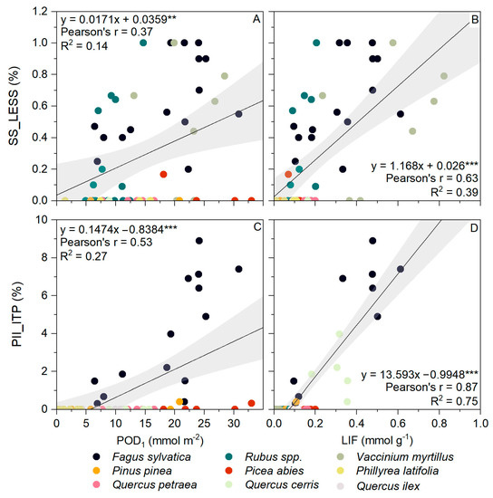 (A) Linear relationship (p = 0.005) between species-specific POD1 and relative frequency of O3 VFI (SS_LESS) over the period 2018–2022 (n = 55). (B) Linear relationship (p < 0.001) between LIF and relative frequency of O3 VFI (SS_LESS) over the period 2018–2022 (n = 55). (C) Linear relationship (p < 0.001) between species-specific POD1 and mean percentage value of leaf area affected by O3 VFI for ITP-dominant species (PII_ITP) over the period 2018–2022 (n = 44). (D) Linear relationship (p < 0.001) between LIF and mean percentage value of leaf area affected by O3 VFI for ITP-dominant species (PII_ITP) over the period 2018–2022 (n = 44). The linear regression lines show 95% confidence intervals in gray. ** p < 0.01, *** p < 0.001.
