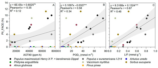 (A) Linear relationship (p = 0.09, ns) between AOT40 and Plant Injury Index (PII_FACE) calculated for species hosted in the O3 FACE (n = 25). (B) Linear relationship (p = 0.003) between POD1 and Plant Injury Index (PII_FACE) calculated for species hosted in the O3 FACE (n = 25). (C) Linear relationship (p < 0.001) between LIF and Plant Injury Index (PII_FACE) calculated for species hosted in the O3 FACE (n = 25). The linear regression lines show 95% confidence intervals in gray. ns not significant, ** p < 0.01, *** p < 0.001.