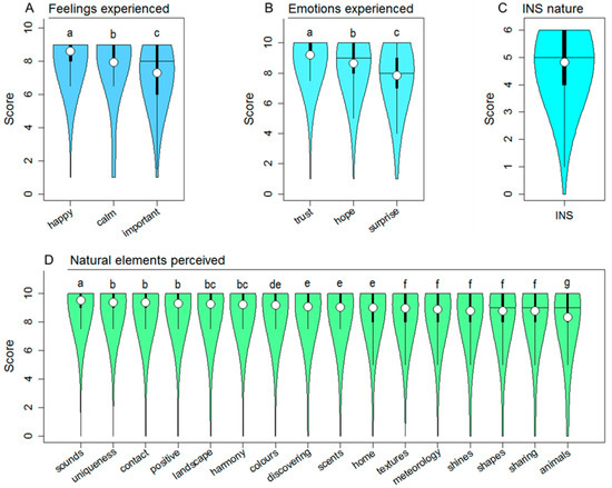 Violin plots showing the scores of the seven well-being indicators (upper panel) and the 16 natural elements perceived to benefit subjective well-being (lower panel) surveyed following forest bathing walks. Horizontal lines within violins indicate medians, and circles indicate means. Kruskal–Wallis tests for the three groups of indicators were significant (p-values < 0.001). Different letters above the violins show significant differences in the post-hoc Dunn tests (see the materials and methods section for further details).