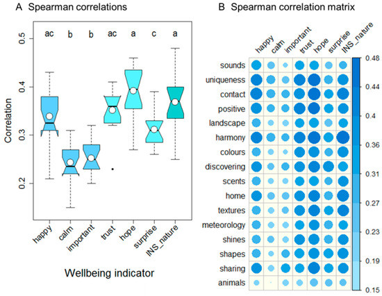 Graphics illustrating the correlation patterns between the seven well-being indicators and the 16 natural elements perceived in forest bathing walks. The boxplot in the left panel (A) shows non-parametric Spearman rho correlation values for the seven well-being indicators. Horizontal lines within boxes indicate medians and white circles indicate means; the bottom and top of each box indicate the first and third quartiles (the 25th and 75th percentiles), and the whiskers below and above each box indicate the furthest data without counting outliers, which, in case there are any, will be represented with black circles (outliers are data greater than the third quartile + 1.5 × third quartile–first quartile or smaller than the first quartile + 1.5 × third quartile–first quartile). Different letters above the boxes show significant differences in the post-hoc Dunn tests after a significant Kruskal–Wallis test. A notch is drawn on each side of the indicator. If the notches of two plots do not overlap, this is “strong evidence” that the two medians differ [71]. Right panel (B) displays the detailed correlation matrix among well-being indicators (top horizontal axis) and natural elements perceived (left vertical axis). The circle size and colour gradient indicate the length of the correlation (as shown in the right scale bar). The complete set of correlation scores and p-values for all indicators can be seen in Tables S4 and S5, respectively.