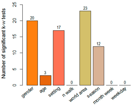 Bar plot illustrating the sociodemographic patterns within the dataset of 23 indicators collected following forest bathing walks. Bars show the number of significant tests obtained after performing Kruskal–Wallis tests on the 23 indicators, by eight sociodemographic and temporal factors. Factors such as nationality and country were excluded because of the low numbers of cases in many categories; then, geographic patterns were investigated by the world area factor (see Materials and Methods section for detailed explanations).