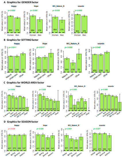 Regarding the effect of sociodemographic and temporal factors, we found four clear patterns shown by the significant Kruskal–Wallis analyses and linked to factors such as gender, setting, world area, and season (Figure 3 and Table S6). The dataset showed a strong pattern by gender since this factor was significant for 20 of the 23 indicators of well-being and natural elements perceived (Figure 3 and Table S6). Women scored higher than men for all 20 indicators found to be statistically significant (Figure 4A and Figure S1).
