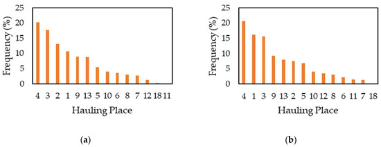 Transportation distance for 10,341 squares: (a) relationship of squares with the individual hauling places; (b) pre-skidding distance; (c) skidding distance; (d) primary transportation distance.