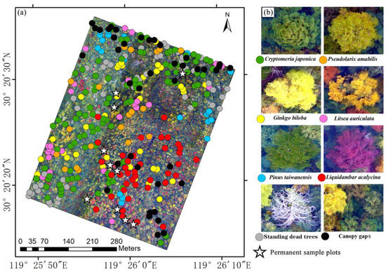 To investigate the characteristics and spatial distributions of target tree species in the study area and collect sample data, three field surveys were carried out, in March, July, and November 2018. In these field surveys, we used Trimble Geo 7X to locate target trees and recorded GPS locations, elevation, species names, and DBH (diameter at breast height). The target trees typically have a large size (the DBH was often larger than 20 cm) and a large crown and are easily recognized by UAV. Meanwhile, in the autumn UAV imageries, Pseudolarix amabilis, Ginkgo biloba, Litsea auriculata, and Liquidambar acalycina appear in different shades of golden yellow and purple, making them easy to distinguish from evergreen broadleaved tree species. In addition, there were 10 permanent vegetation plots (400 m2 in size) established by our research group in this study area ([32]; https://BEST-mountains.org, accessed on 23 March 2023). All woody stems with ≥1 cm DBH were surveyed within each plot. Among them, we selected 22 large tree individuals (DBH > 20 cm) of the target species as a supplement. Finally, we collected 331 ground samples of all objects, with at least 20 samples for every target object. They were 103 Cryptomeria japonica, 20 Pseudolarix amabilis, 23 Pinus taiwanensis, 34 Ginkgo biloba, 39 Liquidambar acalycina, and 25 Litsea auriculata, as well as 48 standing dead trees and 40 canopy gaps (Figure 2a,b).