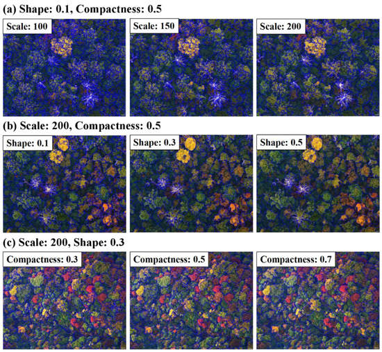We used a bottom-up region-merging technique (multi-resolution segmentation) to generate image objects [40]. Three subsets (0.04 km2 for each) of the UAV RGB images were selected to conduct a series of interactive “trial and error” segmentation experiments [41] in order to determine the proper combination of segmentation parameters (scale, shape, and compactness). All the selected subsets should be representative and contain more than half of the target species. Based on the visual assessment, when the default shape = 0.1 and the default compactness = 0.5, we set the scale parameter to 100, 150, and 200, respectively. We found that 200 was the ‘best’ scale. Then, when the ‘best’ scale = 200 and the default compactness = 0.5, we set the shape parameter to 0.1, 0.3, and 0.5, respectively, and found that 0.3 was the most appropriate value. Then, when the ‘best’ scale = 200 and the ‘best’ shape = 0.3, we set the compactness parameter to 0.3, 0.5, and 0.7, respectively. We found that 0.5 was the best compactness parameter. Finally, the scale, shape, and compactness parameters were set to 200, 0.3, and 0.5, respectively. With these parameters, the adjacent objects with similar features were neither mixed nor over-segmented (Figure 3). This indicates that in the segmentation result, no adjacent similar small tree crowns would be identified as one large tree crown. It also avoids a large tree crown being divided into several small crowns.