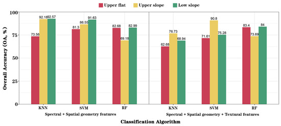 When we divided the study area into three habitat types (Supplementary Figure S2), different classification accuracies among the three habitats were found (Figure 6). When only using spectral and spatial geometry features, KNN had the highest classification accuracies in the upper slope (OA = 92.18%) and low slope (92.57%), and RF had the highest classification accuracy in the upper flat (82.68%). The accuracies in the upper flat and upper slope were higher than the OAs of classification without additional reference data (Supplementary Table S3). The lowest accuracy was obtained from RF in the upper slope (69.18%). After additionally considering texture features, KNN showed significantly decreased performance—the OA decreased by more than 10% in 3 habitats. SVM had more than 10% lower accuracies in the upper flat and low slope, but only 4.35% higher accuracy in the upper slope. The classifier RF slightly increased in OA, by less than 5%, in 3 habitats. Overall, the KNN with spectral and spatial geometric features performed better in most habitats than did SVM and RF (Figure 7; Table 3). Most species achieved better classification accuracies in the upper and low slopes. For example, the PAs of Cryptomeria, Pinus, Ginkgo, Liquidambar, and Litsea were obviously higher in the slope area than in the flat area, by at least 20%.