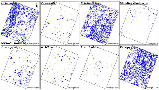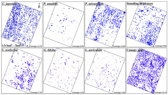 Comparing the combined map of the KNN results of three habitats (Figure 8, referred to as ‘the combined map’) and the results of the study area as a whole (Figure 9, referred to as ‘the integrated map’) with the distribution of ground samples, respectively, we found that for the tree species with a unique spectrum in the leaf senescence period (e.g., Pseudolarix, Liquidambar, Ginkgo, and Litsea), the combined map was more in line with the distribution of ground samples. The integrated map performed better for Cryptomeria and canopy gaps, since some of the patches were over-dense in the combined map. For Pinus, neither of the two maps matched the distribution of ground samples well.