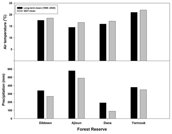 The study was conducted in four natural Jordanian reserves (Figure 1), Dibbeen (32°14′31.47″ N, 35°49′45.97″ E), Ajloun (32°22′55.37″ N, 35°45′51.26″ E), Yarmouk (32°39′36.40″ N, 35°41′40.53″ E), and Dana (30°41′16.89″ N, 35°34′17.23″ E). These forests located within the following bio-geographic zones, Mediterranean Irano-Turanian, and Sudanian (sub-tropical). The mean temperatures and precipitation for the reserves are shown in Figure 2. Each reservation was divided into different zones based on the density and type of tree cover (pure, mixed), elevation, and land usage (open to tourism or no). Dibbeen Forest Reserve is in Jerash, Northern Jordan. This ecological zone (Jerash) contains the last remaining stand of old pine forest in Jordan, as well as approximately 190 km2 of the world southernmost native Aleppo pine (Pinus halepensis) forest []. The reserve is divided into three main habitats: the Aleppo pine area, where the native Pinus halepensis is dominant (zones A, D, and E), the mixed area (zones B, F, and G) where Pinus halepensis, Quercus coccifera and Arbutus andrachne are grown and the dominant evergreen oak (Quercus coccifera) region (Zone C). The reserve’s total area is approximately 8.5 km2. Zone A has an elevation of about 680 m, a dense canopy and is the only site in this reserve that is regularly open for tourism activities. Zones B (840 m), C (970 m), D (710 m), and E (750 m, orchids location) have dense canopies, whereas zone G (673 m) has a scattered to moderate canopy (25%–50%). Zone F (840 m) experienced multiple fires over the past ten years and has moderate canopy density (40%–60%).