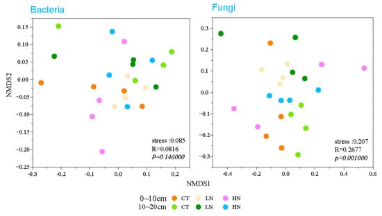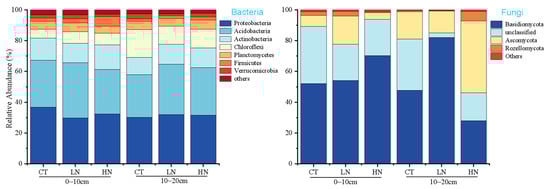 The bacterial and fungal species richness and Shannon’s diversity indexes ranged from 1 424–1 677 to 440.25–680.28, and from 5.48–5.74 to 1.25–3.35, respectively (Table 2). Compared with the CT, no statistical changes in Chao 1 and Shannon’s indexes in bacteria and fungi were observed under LN and HN treatments in either soil layer (p > 0.05, Table 2). However, the values of Chao 1 and Shannon’s indexes in bacteria and fungi in LN treatment were higher than those in HN treatment in the 0–10 cm soil layer (p > 0.05, Table 2).