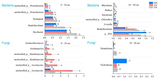 We further detected the changes in sensitive microbial groups at the genus level in response to N application (Figure 3). For bacteria, N application significantly reduced the relative abundance of Bryobacter, Bradyrhizobium, Sorangium, and unclassified_p_Proteobacteria in the 0–10 cm soil layer (p < 0.05, Figure 3). In the 10–20 cm soil layer, N application significantly reduced the relative abundance of Rhizobium, Rudaea, unclassified_p_Chloroflexi, and Bradyrhizobium, but increased Coxiella by 55.56% (p < 0.05, Figure 3). For fungi in the 0–10 cm soil layer, N application induced a significant decrease in the relative abundance of Archaeorhizomyces (p < 0.05, Figure 3). Compared with CT, the relative abundances of unclassified_p_Ascomycota, unclassified_p_Basidiomycota, and Arachnopeziza were significantly increased in LN treatment, but had no significant changes in HN treatment (p < 0.05, Figure 3). In the 10–20 cm soil layer, LN and HN application decreased the relative abundance of Metarhizium, while HN treatment significantly increased the relative abundance of Trichoderma (p < 0.05, Figure 3).
