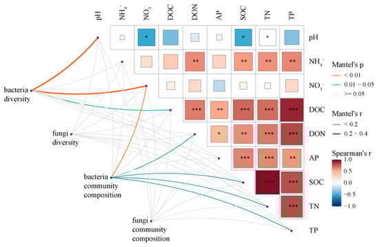 The Mantel test was performed to identify the critical factors influencing bacterial and fungal community diversity and structure after N application (Figure 4). The results showed that bacterial community diversity was positively related with soil pH and NO3−-N, but negatively related to DOC (p < 0.05, Figure 4). NO3−-N, DON, SOC, TN, and TP were the predominant factors responsible for the changes in bacterial community structure (Figure 4). There are no significant relationships between fungal community diversity and structure and soil properties (p > 0.05, Figure 4).