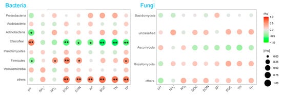 Consistently, soil pH, DOC, DON, AP, SOC, TN, and TP act as the predominant factors contributing to the changes in dominant bacterial phyla, but not fungal phyla (Figure 5). Specifically, soil pH was negatively related to Actinobacteria and Firmicutes (p < 0.05) but positively related to Chloroflexi (p < 0.01). Chloroflexi was negatively correlated with the content of DOC, DON, AP, TC, TN, and TP in soil. Firmicutes was positively correlated with NO3−-N, DOC, DON, and TP content (Figure 5). There were no significant correlations between major fungal phyla and environmental factors (Figure 5).