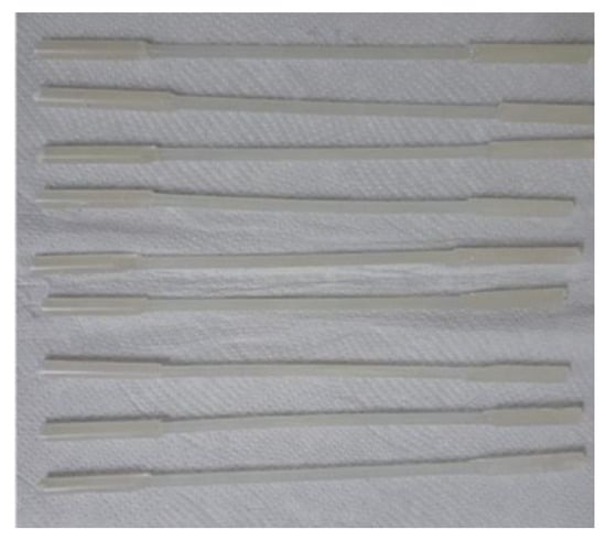 The number of specimens was according to [21]. For each specimen, the longitudinal and transversal deformation parameters, the ultimate tensile strength and the modulus of elasticity were measured, and Poisson’s ratio was calculated.