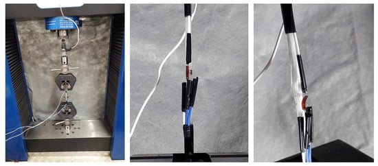 The proportion by volume used in the mix for the manufacture of the dowels was 37% resin and 63% reinforced glass fiber, as indicated by the fiberglass manufacturer Advantex E-CR GLASS (2011) in the technical manual. For a dowel with the dimensions of 195 mm in length, 6 mm in diameter at the ends and 4 mm in diameter at the center, the total volume (3.705 cm3) was filled with 1.65 g of Araldite Ly 1564BR, 0.72 g of Aradur 2963 and 4.04 g of fiberglass. The dowel’s total weight was recorded, and the dimensions were measured. Eleven specimens were produced (Specimens 1 to 11), and six of them were selected through visual grading for the tension test (Specimens 5 to 10). The test followed the provisions of [21]. A tension force with a controlled loading rate was applied in order to simultaneously measure the tangential and longitudinal deformations with the help of strain gages (brand KFG-5-120-C1-11, Kyowa, Osaka, Japan). Each specimen was lightly sanded so that the strain gauges adhered more easily. Markings were made to centralize the gauges in the specimens. Before being glued, the strain gages were tested with a Minipa multimeter ET3021 to detect possible defects, which did not occur. The precision adhesive used for bonding the strain gages was Super Bonder (Loctite brand). This adhesive is based on cyanoacrylate, and its main characteristic is its anaerobic curing in the absence of air. It hardens within a brief time from 10 to 30 s, and must be applied with uniform pressure over the whole area of the strain gage. After bonding, the strain gages were tested again with a multimeter, which confirmed the resistance of 120 ohms, according to the technical data sheet on the package.
