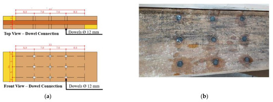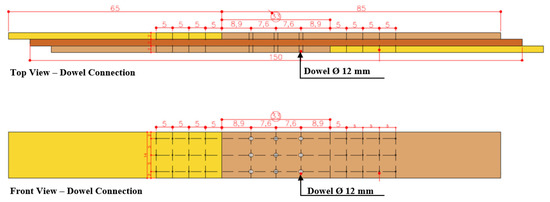 The connection used to perform the test was based on the research of [22]. Nine dowels were inserted into pre-drilled holes, with no fastening material between the dowels and the timber pieces. The process of analysis consisted of checking the transmission of effort in the splicing area as well as the rupture mechanism, submitting the connection to shear stress with a double shear section. The dowels’ positioning and the minimum space between the connective elements were according to the directions of [13], with the splice length set to 330 mm. Figure 6 shows the elements’ dimensions and the dowels’ positions. In the figure, it is possible to see that the splicing length of 330 mm consisted of three layers: a continuous inner layer and discontinuous outer layers. Nine GFRP 12 mm diameter dowels were inserted in the splicing area as shown in Figure 6.