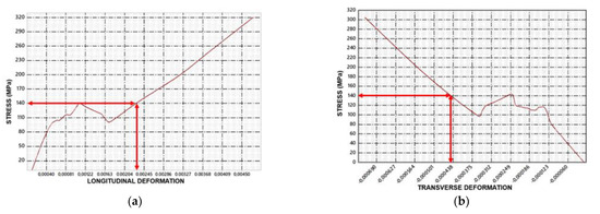 Figure 8a,b above shows the linear behavior with constantly declining lines for both longitudinal and transversal deformation with the stress values MPa and MPa. From the test results, it was possible to determine the features of the dowels made according to a composite formulation (resin + fibers), which showed isotropic behavior. Table 1 shows the features of a structural composite dowel.