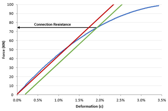 Figure 9 shows the curve of a typical connection’s behavior under tension. The resistance of the connection was obtained by tracing a parallel straight line 0.2% away from the secant line, according to [13].