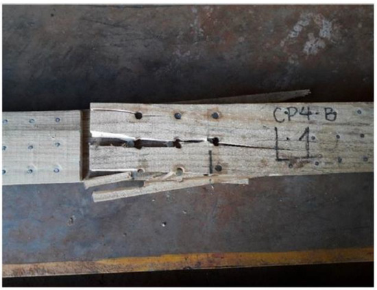 When analyzing the results, we noted that SP 11 showed a low value (28.8 kN); the reason for this result can be explained by the resistance of the board used for making the connection, where parts were cut close to the tree’s pith. During the evaluation of the mode of failure, according to Figure 10, it was observed that all of them broke in the timber, not due to the shear of the dowels, thus increasing the coefficient of variation of the results. According to Table 3, the average value of the maximum displacement was 2.07 mm. In an analysis of the average values of the resistances, not considering the performance of SP 11, the values of the other specimen showed quite high results.