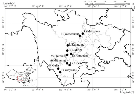 Locations of the 10 sampled populations of C. yunnanensis in Sichuan Province.