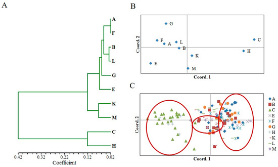 - Peakall, R.; Smouse, P.E. GenAlEx 6.5: Genetic analysis in Excel. Population genetic software for teaching and research–an update. Bioinformatics 2012, 28, 2537–2539. [Google Scholar] [CrossRef]